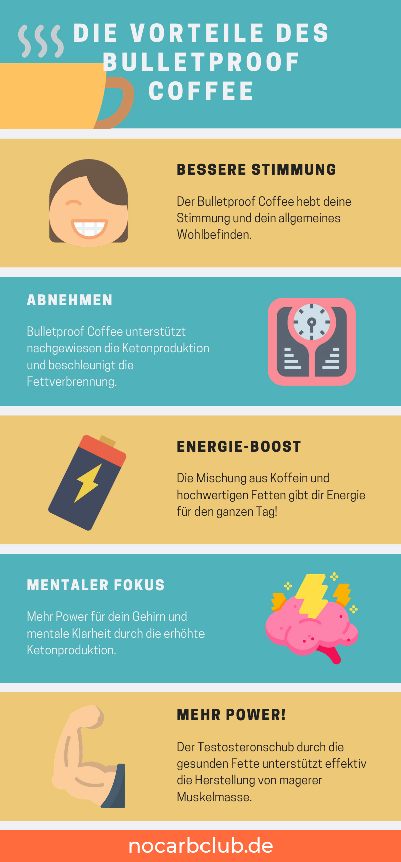 Der Bulletproof Coffee regt deine Fettverbrennung an und gibt deinem Körper einen gewaltigen Energieschub, der über Stunden anhält. Du fühlst dich produktiv und kannst dich besser konzentrieren, außerdem bleibt dein Energielevel lange auf voller Power und Stimmungstiefs gehören der Vergangenheit an. Die Vorteile des Bulletproof Coffees sind also nicht von der Hand zu weisen: